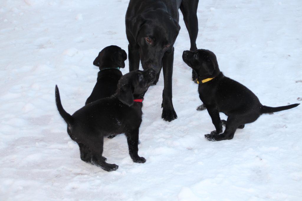 9.1.2024 Pennut ovat 6 viikkoisia ja pakkaset hellittivät, joten pennut pääsivät ulkoilemaan ja tutustumaan miltä lumi sekä talvi tuntuu.
