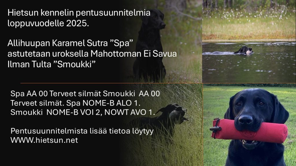 Hietsun kennelin seuraava pentusuunnitelma on astuttaa Allihuupan Karamel Sutra ”Spa” uroksella Mahottoman Ei Savua Ilman Tulta ”Smoukki”. Span juoksujen odotetaan tulevan loppusyksystä 2025. Koirat ovat terveitä kummankin pevisa tiedot AA 00 sekä terveet silmät.